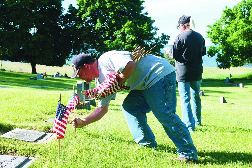Last Saturday, Justin Davis (left) and Victoria Twardokus (right) place flags upon the graves of veterans in preparation for Memorial Day last weekend.