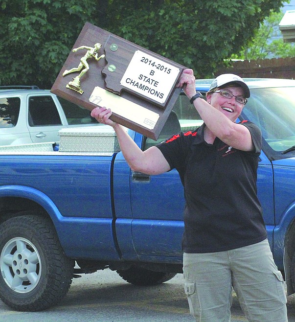 Plains Head Coach Denise Montgomery proudly displays the Class B hardware to a crowd of supporters at Plains High School last weekend. This year's state title was the Trotters third consecutive championship.