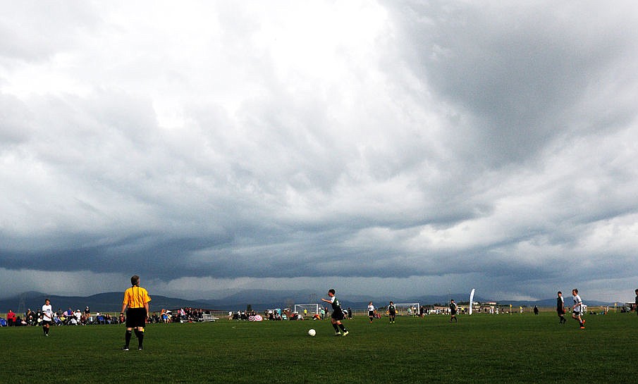 Rain clouds start to form in the sky during a soccer game for the Three Blind Refs. (Aaric Bryan/Daily Inter Lake)