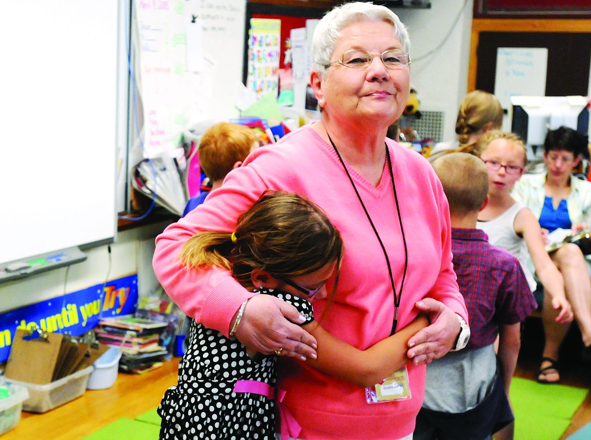 "Gramma" Linda Ott Gimbel gets a hug from Jaylnn Wilson at Russell Elementary on Thursday. Gimbel volunteers at the school five days a week.