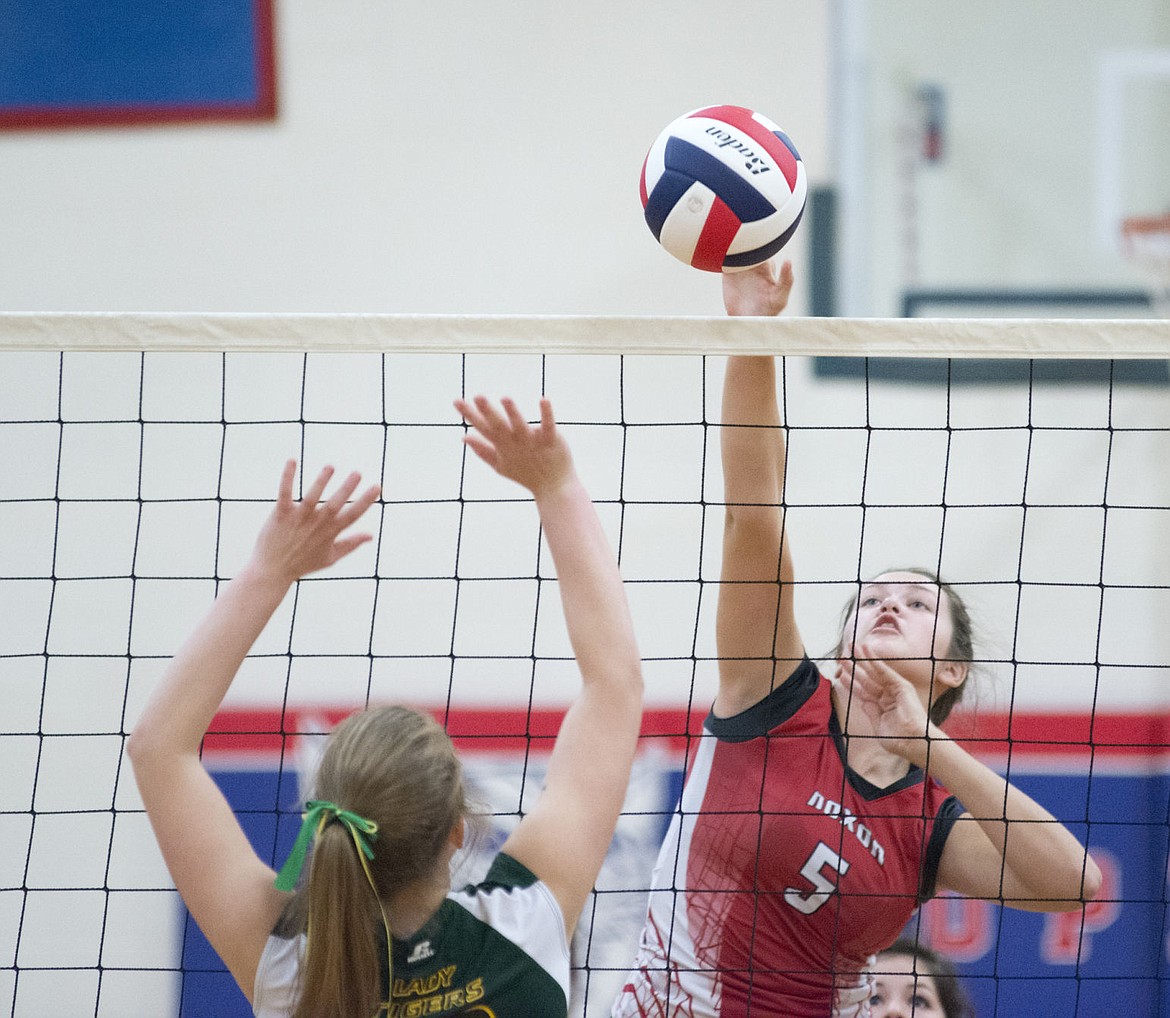 Cory Brodmerkle spikes the ball against the ball against the St. Regis Lady Tigers.