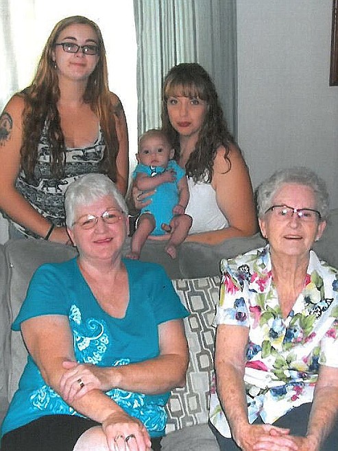 (Left to right) Front: Great-grandma Jan Heaton and great-great-grandma Judy Gardipe Cady. Back: Mom Savannah Longtin and grandma Wendy Rorco holding Myloh.