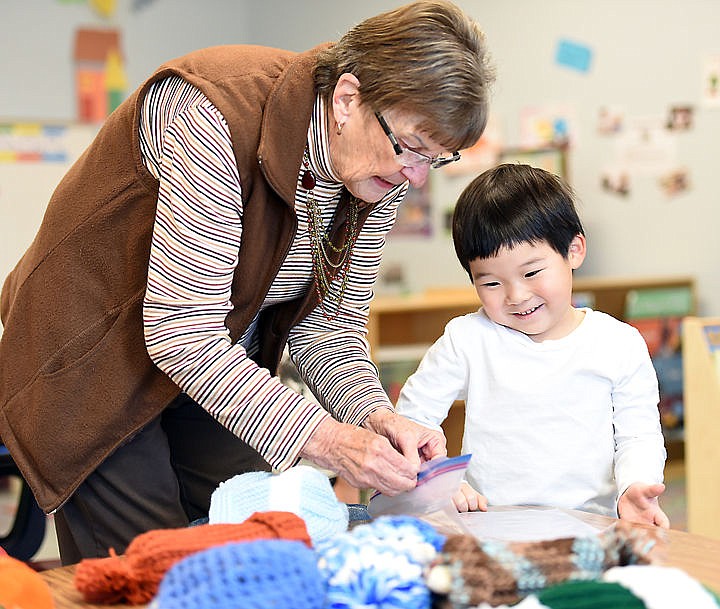 Diane Williams, an 11 year member of the Retired and Senior Volunteer Program, puts the knitted cap and mittens Justin Guan, right, picked out for himself at the annual give away on Tuesday, November 10, at Head Start in Kalispell. Williams has knitted 2,200 hats. She makes her with the pom-poms on top, it is a visual cue which hats are ones she made and it always makes her smile to see them being worn. Williams said it take around 3 hours for each hat. (Brenda Ahearn/Daily Inter Lake)