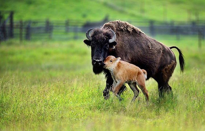 A Bison and her calf at the Spring Brook Yak Ranch in Kalispell on June 23, 2013. (Brenda Ahearn/Daily Inter Lake)