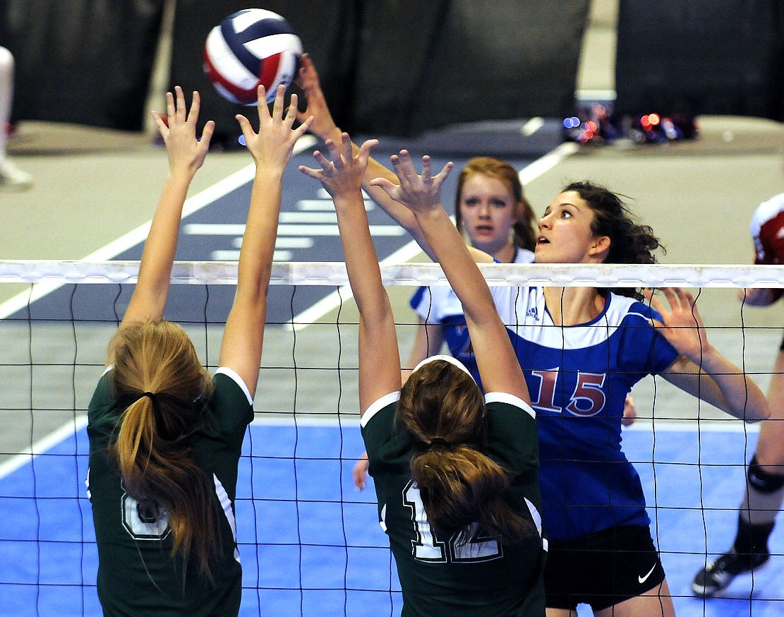 Columbia Falls' Morgan Stenger tips the ball past a pair of Billings Central defenders in the Wildkats 4-set win to open the Montana state championship in Bozeman on Thursday. (Aaric Bryan/Daily Inter Lake)