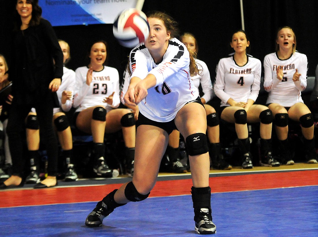 Flathead's Xio Lopp returns the ball against Billings Skyview during the Bravettes opening round win in the Class AA Montana state championship in Bozeman on Thursday. (Aaric Bryan/Daily Inter Lake)