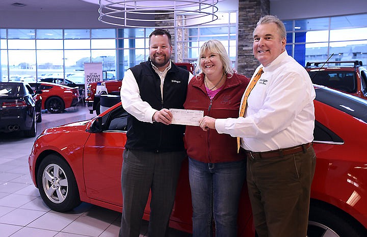 Bob Eisinger, general manager of Eisinger Honda, left, and Greg Eisinger, owner operator of Eisinger Motors, right, present a check to Lori Botkin, executive director of the Flathead Food Bank, for $10,000 for the Backpack For Kids Program on Friday, November 13, in Kalispell. (Brenda Ahearn/Daily Inter Lake)