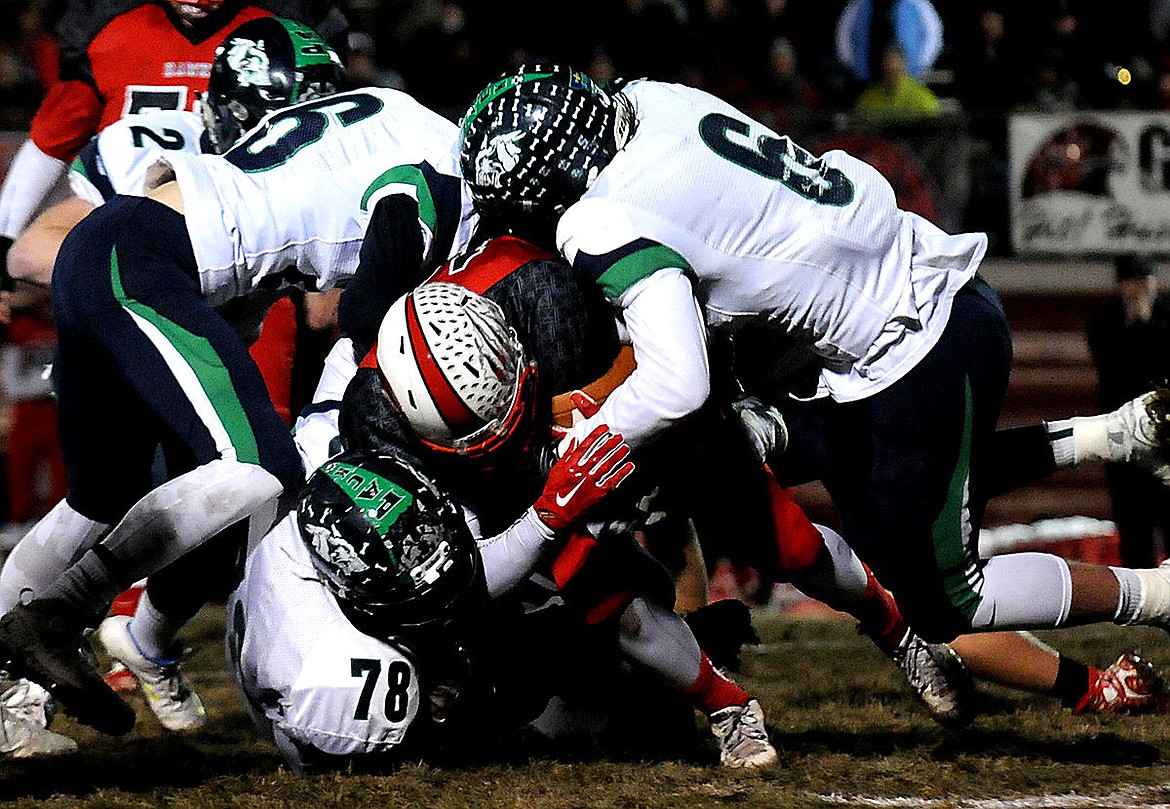 Troy's Scott Pate crashes into the pit during the long jump at the Class B state track and field championship in Kalispell on Friday. Pate finished in second with a jump of 20 feet, 11.5 inches. (Aaric Bryan/Daily Inter Lake)