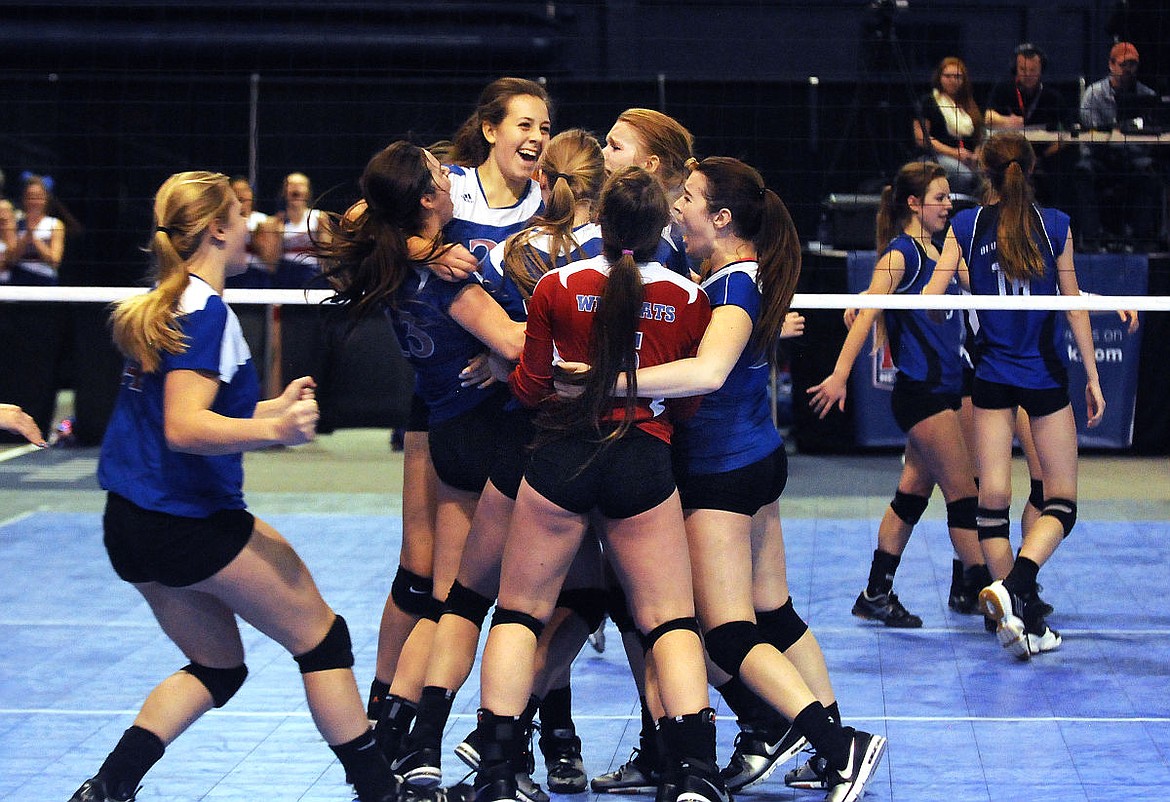 The Columbia Falls Wildkats celebrate after beating Corvallis in straight sets to win the Class A state volleyball championship in Bozeman on Saturday, Nov. 14. (Aaric Bryan/Daily Inter Lake, file)