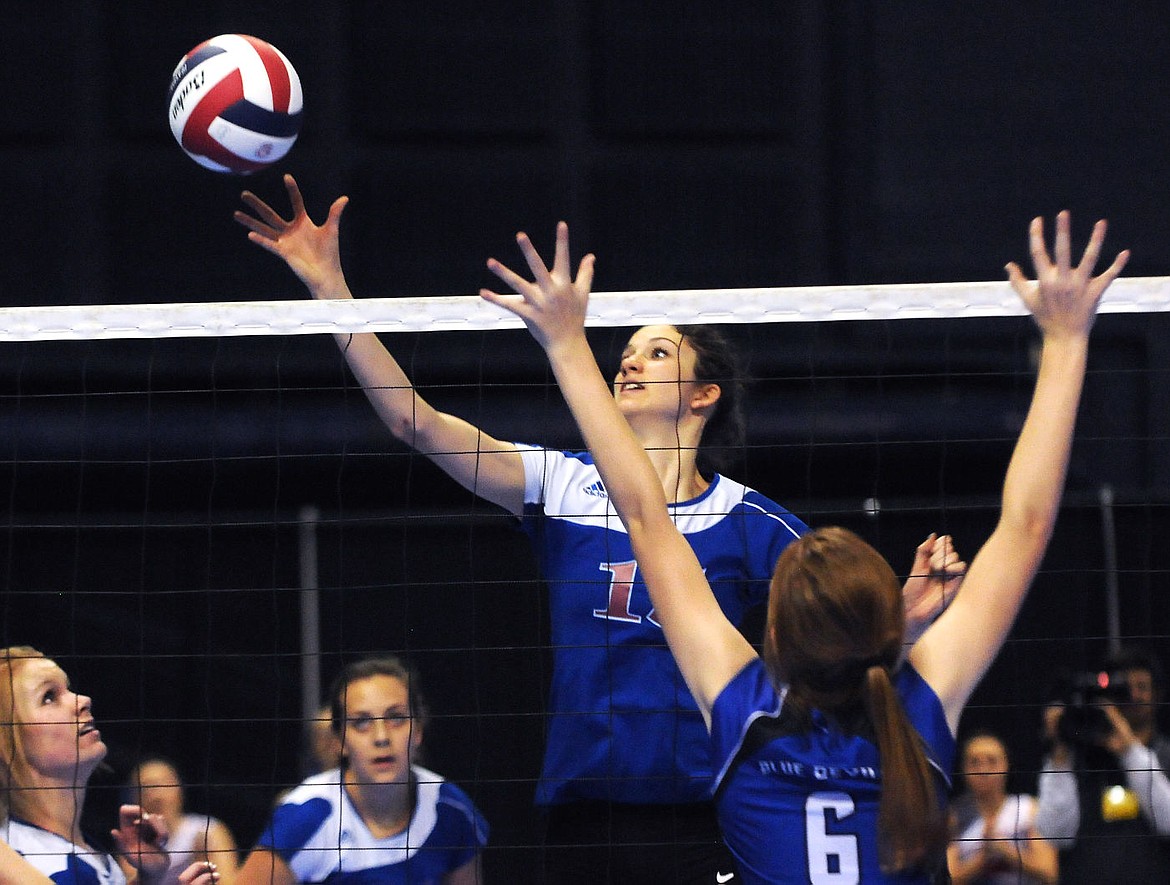 Columbia Falls' Morgan Stenger tips the ball past Corvallis' Genesis Kieth during the Class A state volleyball championship match in Bozeman on Saturday. (Aaric Bryan/Daily Inter Lake)