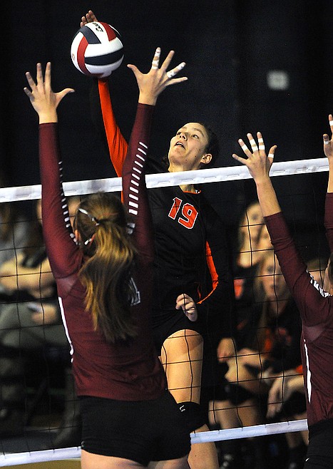 Troy's Scott Pate crashes into the pit during the long jump at the Class B state track and field championship in Kalispell on Friday. Pate finished in second with a jump of 20 feet, 11.5 inches. (Aaric Bryan/Daily Inter Lake)