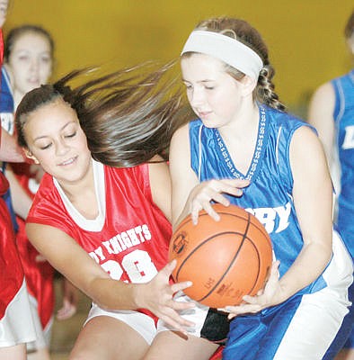 Troy's Izzy Ramirez looks for a steal from Ashlyn Monigold during the middle school girls basketball jamboree Saturday.