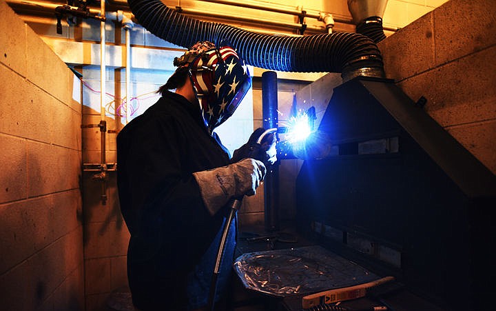K.J. Jellar, a college freshman majoring in welding and fabrication, spends some personal time Monday working in the Occupational Trades Building at Flathead Valley Community College. (Brenda Ahearn/Daily Inter Lake)