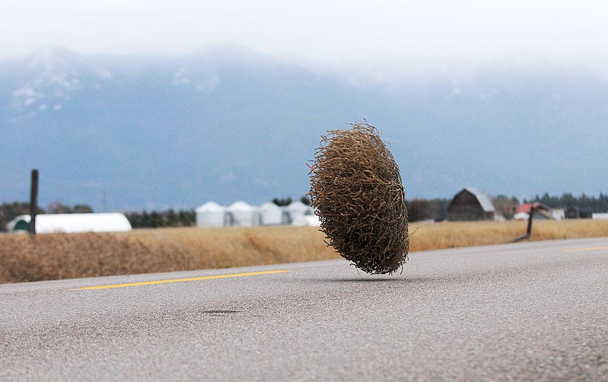 A tumbleweed is blown across Holt Stage Road in the Creston area on Tuesday. (Aaric Bryan/Daily Inter Lake)