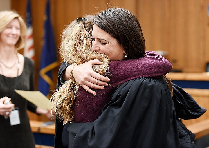 Amy Eddy gets a hug from her friend Monica Pastor of Whitefish after being sworn in as district judge in the 11th Judicial District on Wednesday afternoon, November 18, at the Flathead County Justice Center in Kalispell. Eddy replaces retired District Judge Ted O. Lympus. (Brenda Ahearn/Daily Inter Lake)