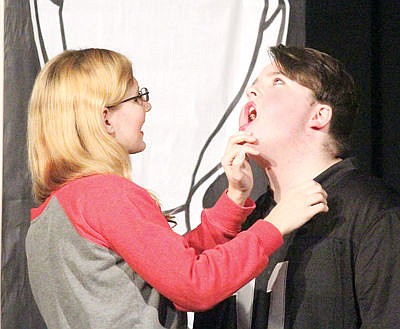 Scene 2: Brace Youself with Kasey Faur, left, as Piper and John Fossen as James. Piper prepares to pull an eraser out of James' mouth.