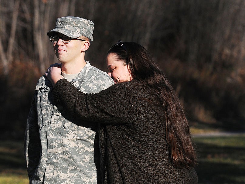 Barbara Anderson hugs her son Michael Gordon. Gordon, a private in the U.S. Army, will be deployed before he gets to spend the Christmas season with his family. (Aaric Bryan/Daily Inter Lake)