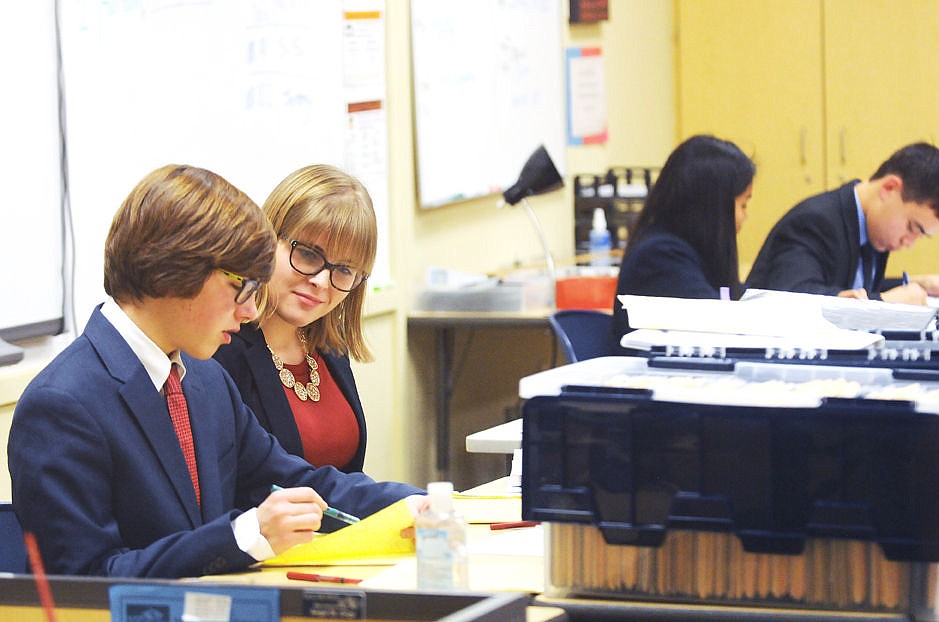 Glacier's Harrison Rennie, left, and Kelsie Davis go over notes during their varsity policy debate at Glacier High School during the first day of the Western Regional Speech and Debate Tournament on Friday. (Aaric Bryan/Daily Inter Lake)