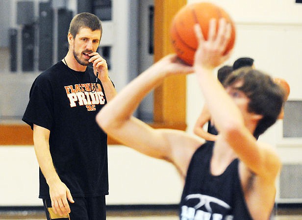 Flathead basketball coach Ross Gustafson directs practice at Flathead High School on Saturday, Nov. 21. (Aaric Bryan/Daily Inter Lake)