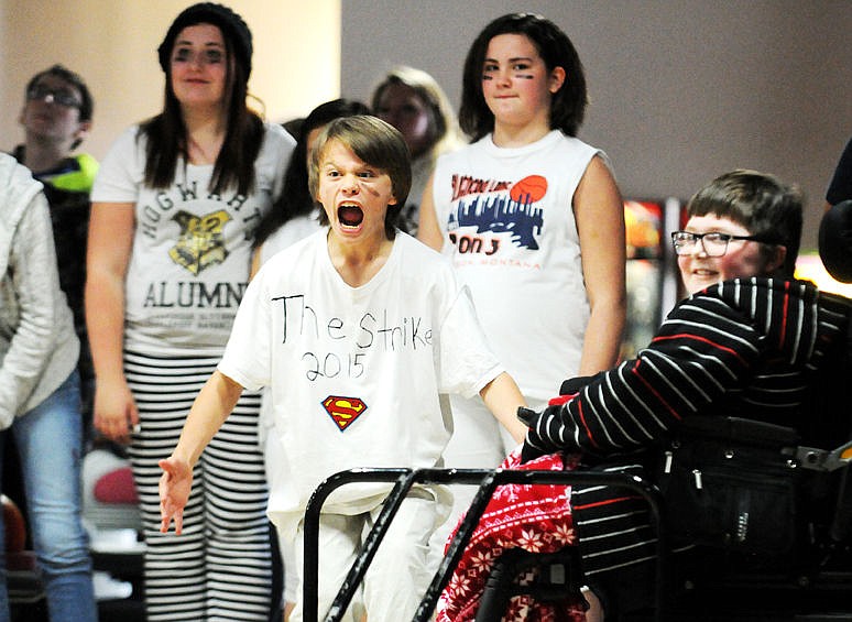Camden Butterfield cheers as he watches Tyler Mischke, right, bowl a strike during the Bigfork's Middle School Partners Club's unify activity at Pick's Bowling Center on Friday.