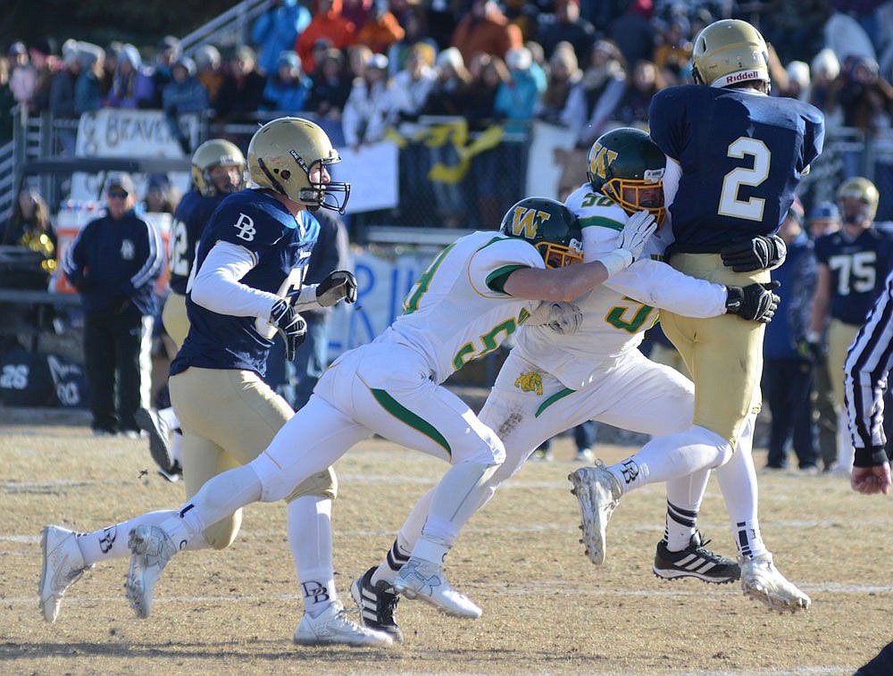 Whitefish defenders Logan Wynn and Patrick McGeady combine to tackle Dillon quarterback Troy Anderson in the State A championship game Saturday at Dillon. (Matt Baldwin/Whitefish Pilot)