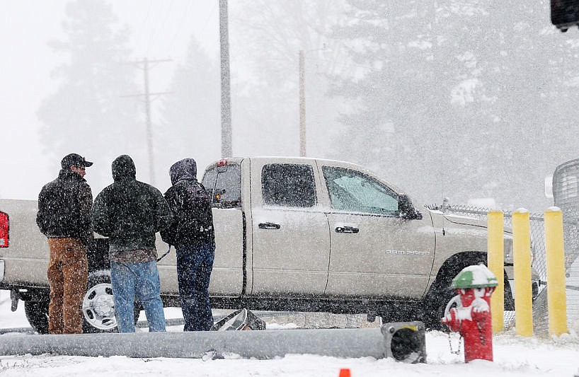 A Ram truck is stopped against a chainlink fence after sliding off the road and knocking down a lightpole at the intersection of U.S. 2 and Evergreen Drive. (Aaric Bryan/Daily Inter Lake)