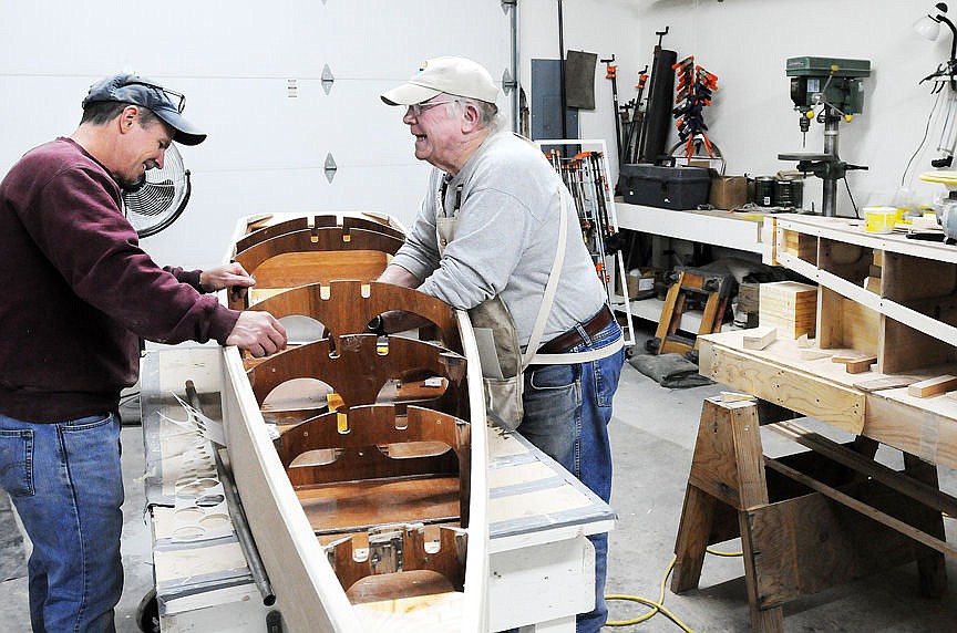 Bill Eisenlohr, right, asks his son John Eisenlohr for advice to install the steering pedal on his Mini Skeeter ice boat. (Aaric Bryan/Daily Inter Lake)