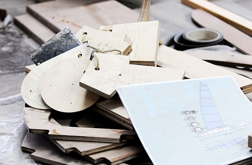 The patterns and the plans for the ice boat John Eisenlohr designed sit on a table at the Montana Wooden Boat Foundation. (Aaric Bryan/Daily Inter Lake)