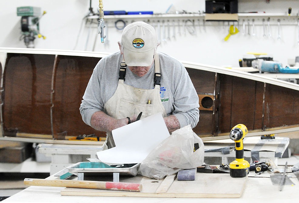 Bill Eisenlohr cuts out a pattern for steering bushing for the ice boat he is building. The boats take about 80 hours to build. (Aaric Bryan/Daily Inter Lake)