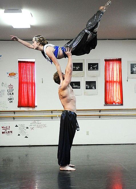 Casey Kostecki lifts Megan Bridwell into the air as they rehearse the "Nutcracker,". (Aaric Bryan/Daily Inter Lake)