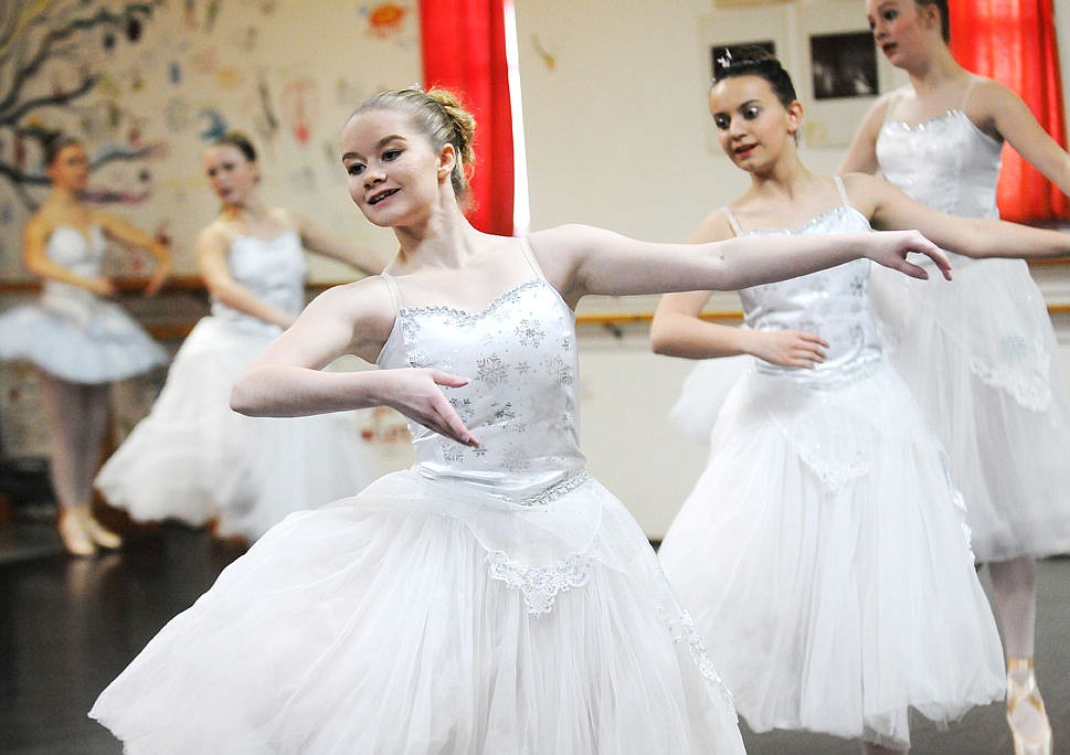Katie Carr dances with the snowflakes during a rehearsal for the Northwest Ballet Company's performance of the "Nutcracker," at the Dance Arts Center on Saturday. (Aaric Bryan/Daily Inter Lake)