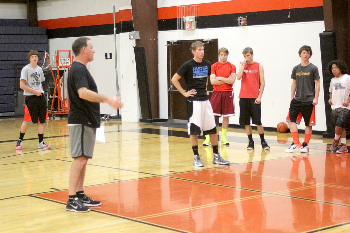 One of the assistant coaches speaks to the team during the first practice session of the Horsemen basketball team.