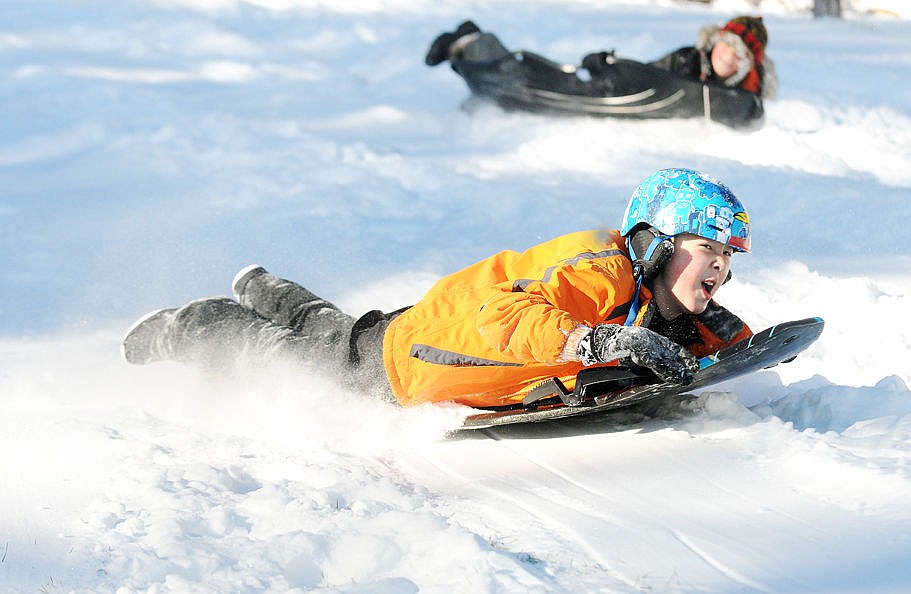 Joshua Nguyen, front, and Connor Phillips sled down the hill at Lawrence Park last Wednesday. The Kalispell Middle Schoolers took advantage of their day off from school for "the best day of sledding ever."