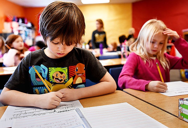 Benjamin Joy and Vivian Frederick concentrate on a writing assignment in Kitty Dowaliby's second grate on Monday, November 30, at Muldown Elementary School in Whitefish. The second grade is the has the most students per grade at Muldown with seven classes for 142 students. (Brenda Ahearn/Daily Inter Lake)