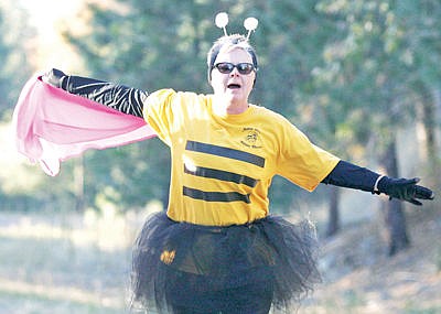 Boo Bee Judy Foss gets her cape under control as she descends from the Haul Bridge into J. Neils Park Saturday during the Paint It Pink Fun Run.