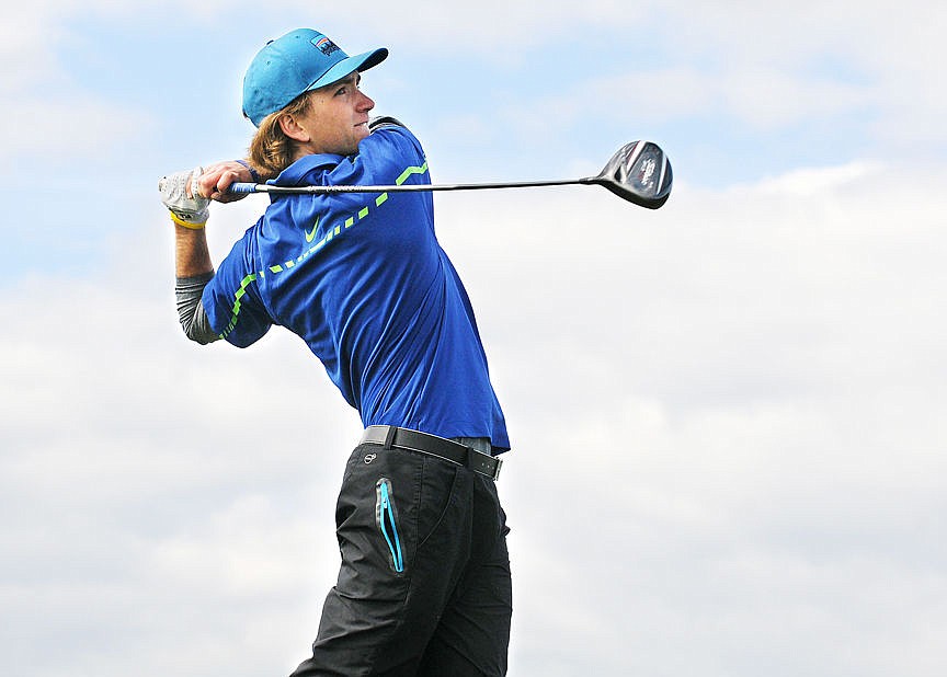 Glacier's Tommy Mann crushes a drive while playing at Northern Pines earlier this season. Mann won the Class AA state golf individual championship on Friday in Helena. (Aaric Bryan/Daily Inter Lake)