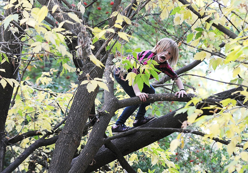 Bristol Lessor screams like a monkey as she climbs a tree at Woodland Park on Friday. (Aaric Bryan/Daily Inter Lake)