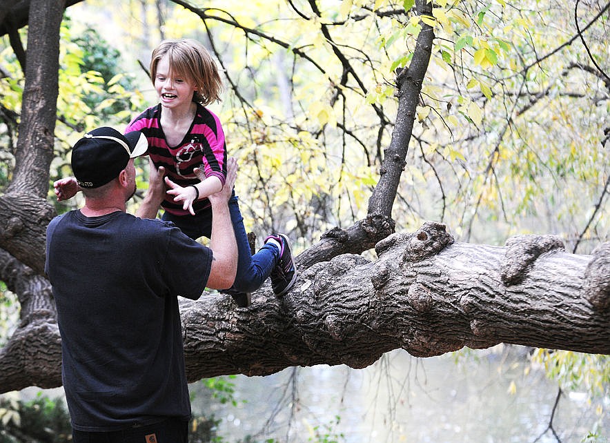 Bristol Lessor jumps into Nate Collier's arms after climbing a tree at Woodland Park on Friday. (Aaric Bryan/Daily Inter Lake)