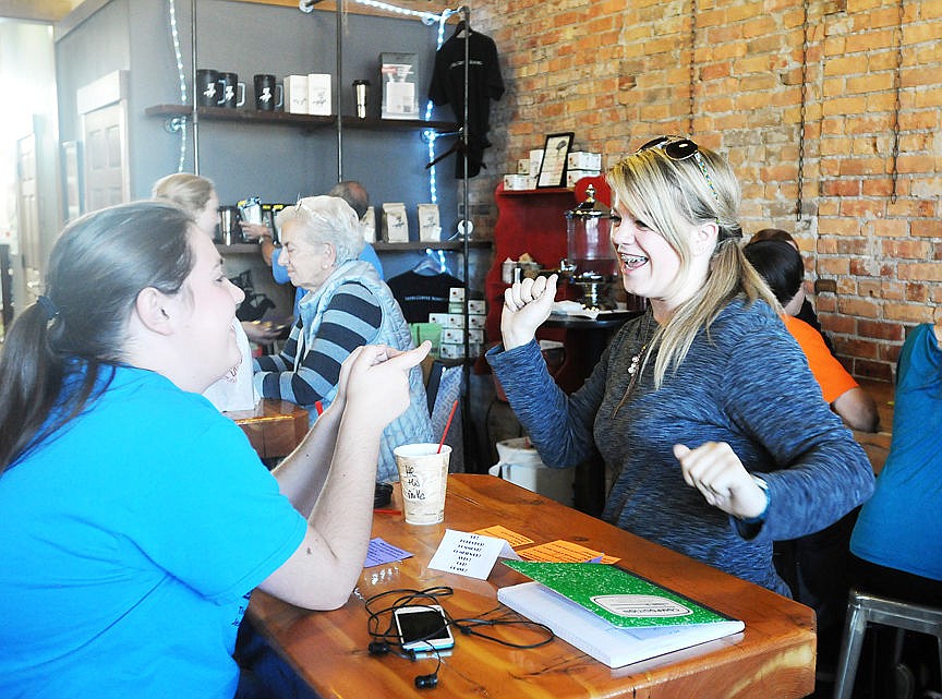 Mica Riendeau, right, and Sydney Bean laugh as the two Flathead sophomores converse in French during the Conversation Cafe at Colter Coffee on Wednesday. (Aaric Bryan/Daily Inter Lake)