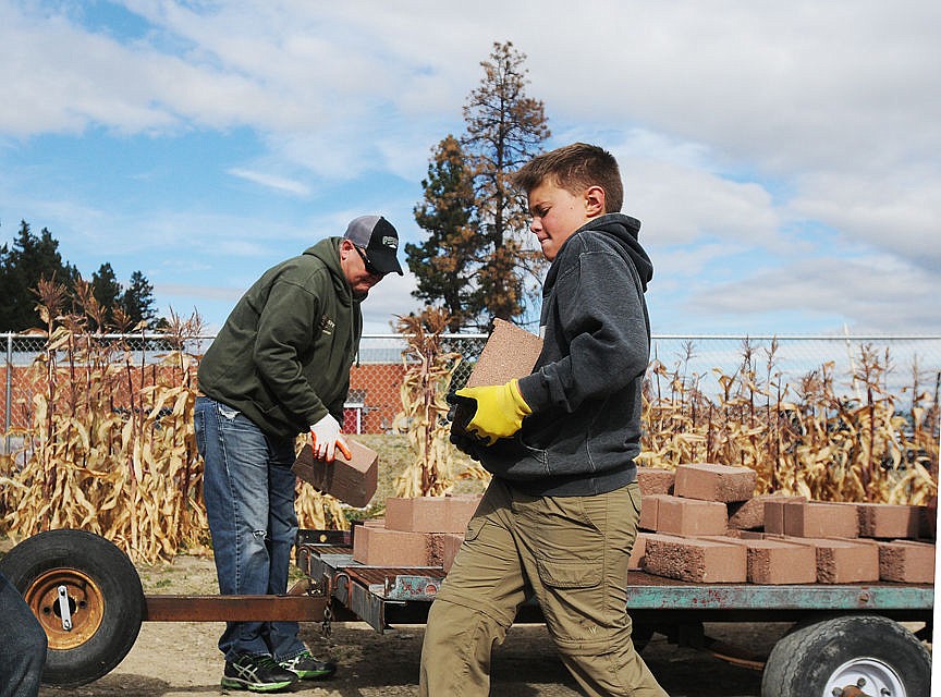 Morgan Hulford, a seventh-grader at Kila Middle School, carries bricks as he helps build a pathway for the raised garden beds. (Aaric Bryan/Daily Inter Lake)