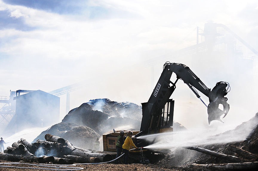 Firefighters work to extinguish burning hog fuel piles at the F.H. Stoltze Land and Lumber Co. mill near Columbia Falls on Saturday. (Aaric Bryan/Daily Inter Lake)