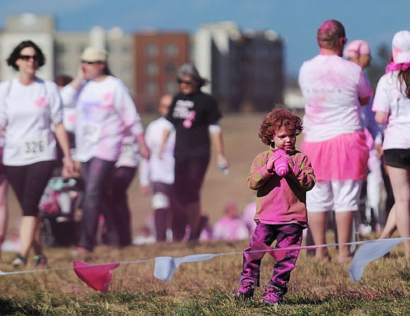 Finnian Donaldson, 3, waits to spray somebody with pink coloring at a station at the PInk Me Up! at the Flathead Valley Community College on Sunday. (Aaric Bryan/Daily Inter Lake)