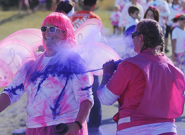 Julie Johnson of Somers is sprayed with purple coloring as she nears the finish line of the PInk Me Up! (Daily Inter Lake/Aaric Bryan)