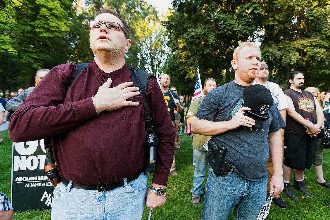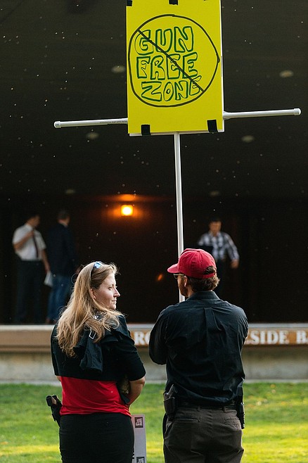 Stavis was among the more than 200 people who attended the Idaho Second Amendment Alliance's Constitutional Carry Gun Rally in Coeur d'Alene City Park Saturday evening. Many proudly carried their firearms and shared their passion for American citizens' right to bear arms. Some held signs that read, “No permission needed,” “Obey God not men” or “Gun-free zone” with a slash through the words. Many brought their families and canine companions as they listened to the speakers and supported the Alliance's message.