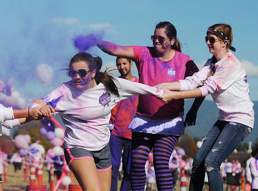 Shawn Chouinard douses her daughter Riley as she is being held by Amber Crevier at the finish line of the Pink Me Up race at Flathead Valley Community College on Sunday. More than 2,500 people participated in the 1 kilometer and 5 kilometer walk and run. Proceeds from the event will go toward the opening of Cancer Support Community Kalispell. (Aaric Bryan/Daily Inter Lake)