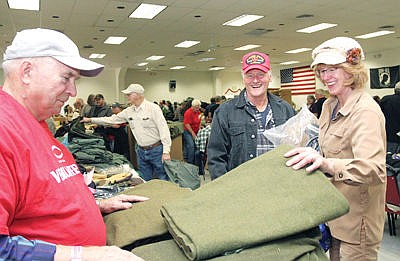 Stand Down volunteer Gene Adkinson, left, Mike Murchie and Jana Murchie at VFW Post 1548. Sixteenth annual Libby Stand Down. Services available: Haircuts, surplus military clothing, service officer for VA Clinic, physical health provider, employment counseling, referrals to community resources, refreshments, disabled parking.
