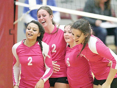Post game jube with Olivia Roach, left, Sami Rohrich, Tana Thill and Aurora Becquart. Troy over Bigfork in five: 22-25, 29-27, 27-25, 10-25, 15-10.