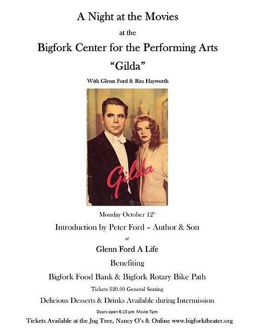 "Gilda" will screen at the Bigfork Center for the Performing Arts on Monday, Oct. 12. The event will feature an introduction by Peter Ford, son of late movie star Glenn Ford. Doors open at 6:15 p.m. For more information, visit www.bigforkcenter.org.
