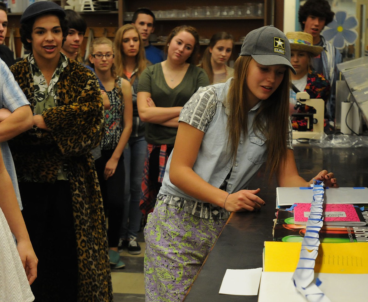 Grace Cady drops a marble in the contraption she built during the Montana Outreach tour at Flathead HIgh School on Thursday. Professors from the University of Montana taught classes at Glacier and Flathead. (Aaric Bryan/Daily Inter Lake)