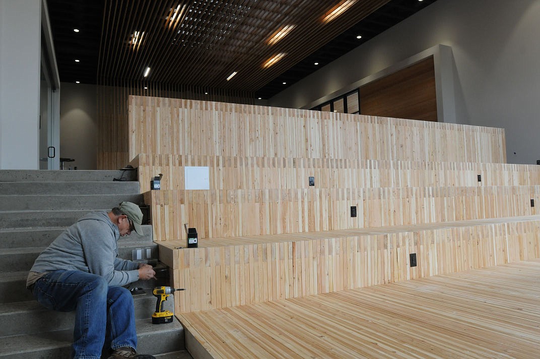 Mike Janetski installs step lights in the new seating of the Stillwater Christian addition on Friday. (Aaric Bryan/Daily Inter Lake)